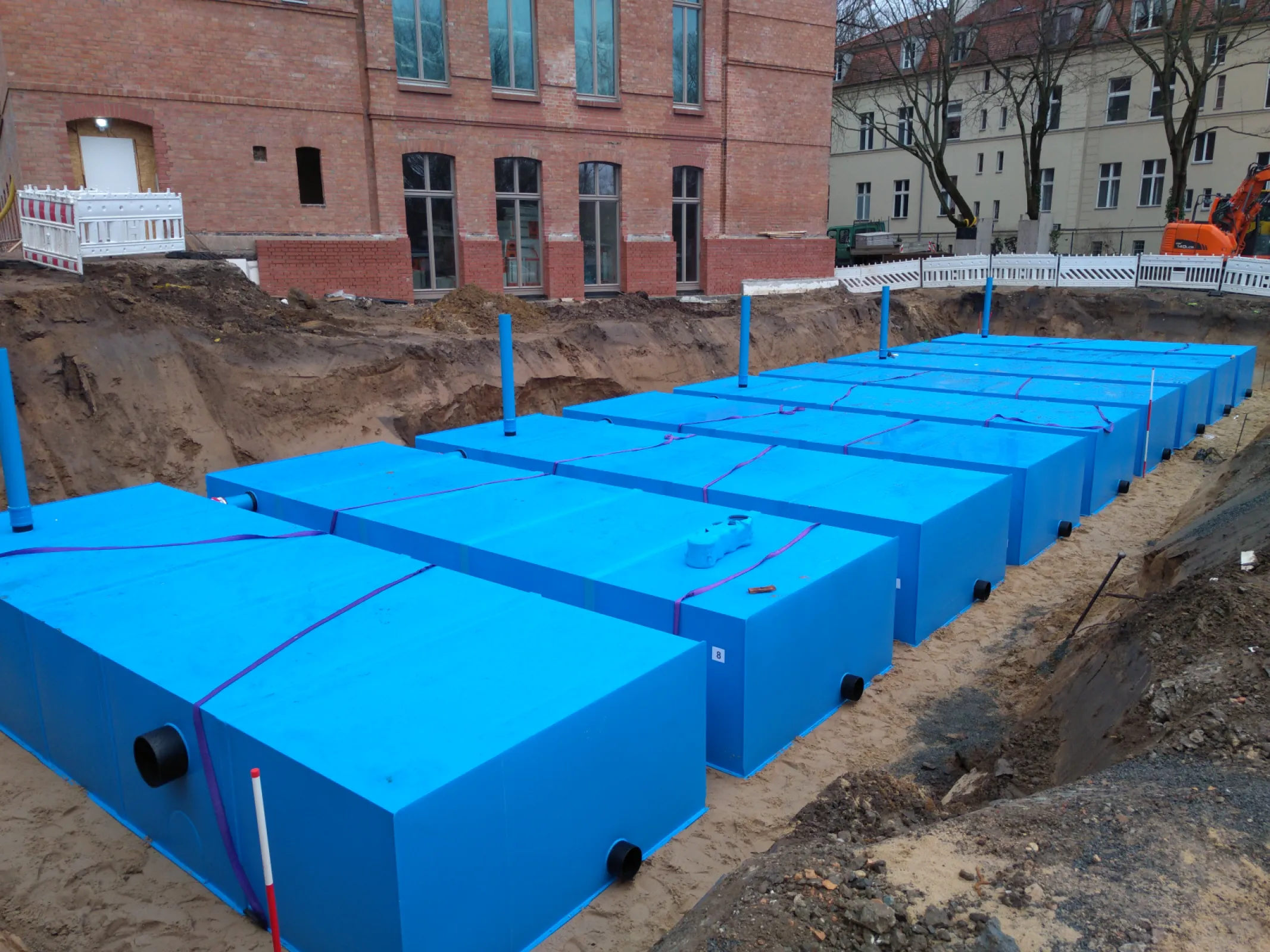The KS-Bluebox® consists of pre-assembled plastic-sheathed D-Raintank 3000® elements. This variant of the D-Raintank 3000® system is suitable not only for intermediate rainwater retention, but also for permanent storage, with a view to later removal and use.